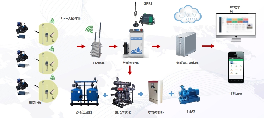 建立水肥一体化系统,将数据采集端、水肥机、田间管道、电磁阀、过滤系统搭建完成。